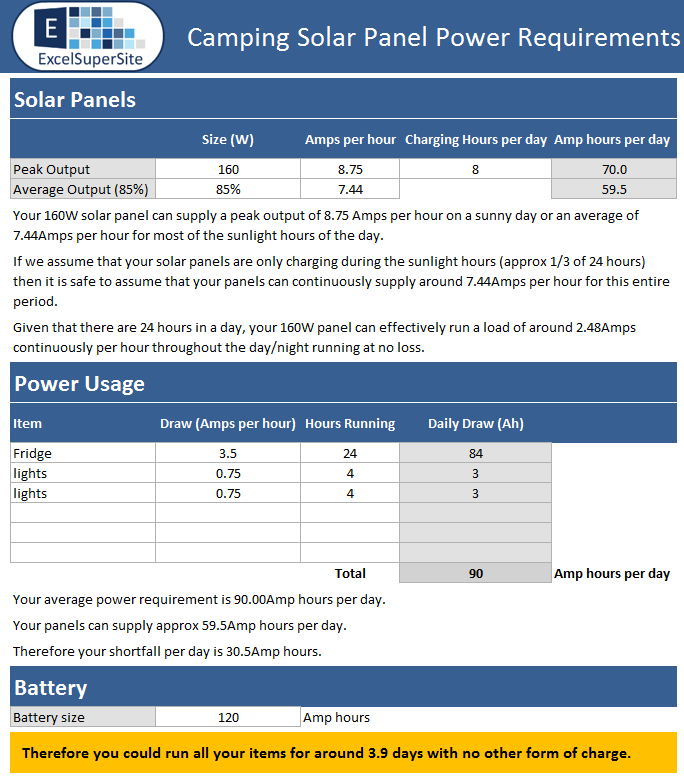 Fortunately, we have developed a simple to use Excel spreadsheet, that allows you to input information about the equipment you use and your power usage and it will let you know if your solar panels will typically meet your needs.