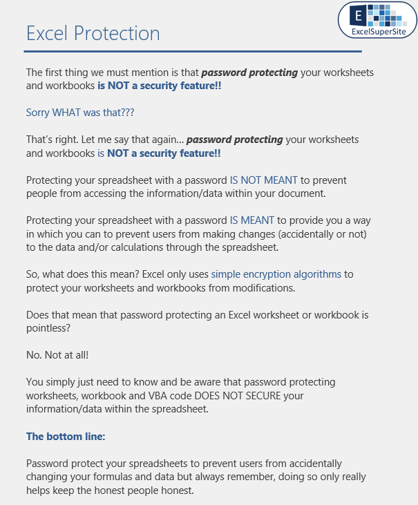 ExcelSuperSite makes NO GUARANTEE that following the instructions presented within this guide, you will be able to successfully unprotect your Excel spreadsheet.